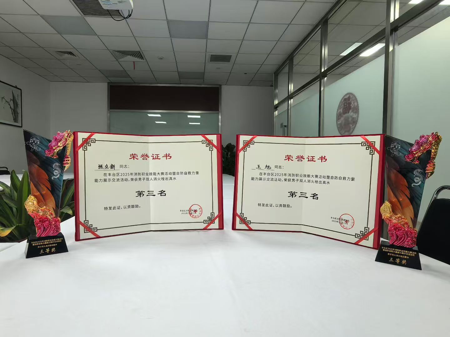 近日,由豐臺區消防救援支隊、區防火安全委員會辦公室及區總工會聯合舉辦的“2025年豐臺區消防職業技能大賽暨自防自救力量能力展示交流活動”順利舉行。公司國投項目員工張立新、王旭兩位同志,代表太平橋街道出戰(zhàn)本次大賽,最終在雙人賽男子組消火栓出真水項目中脫穎而出,榮獲全區第三名的優(yōu)異成績。